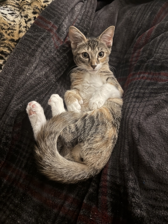 Ooh! Darling, Darling, Darling! I'm so comfy and cozy on this super soft blanket! My belly is all warm and my paws are tucked in for maximum nap power! I feel so safe and loved here with you. Could you maybe give me a little chin scratch, please? And then perhaps a teeny tiny playtime with my favorite crinkle ball? Yay! Love you!