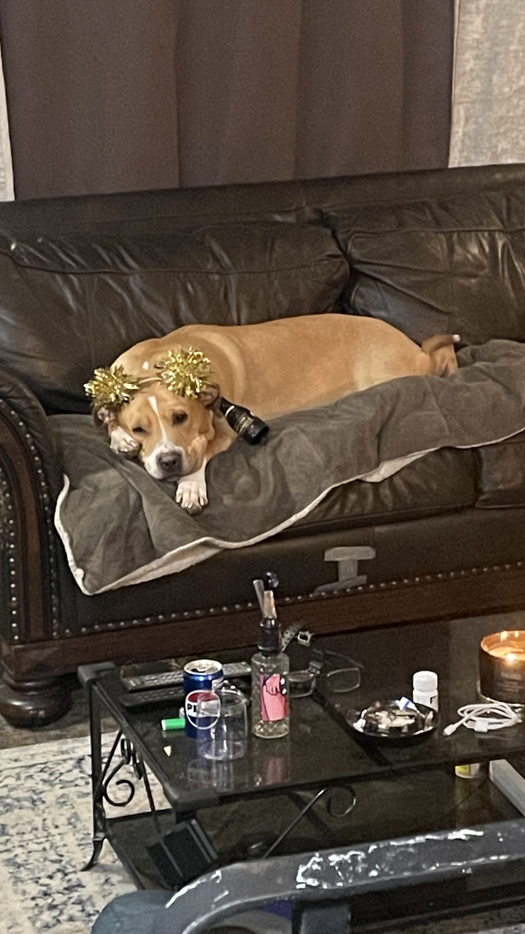 Oh, hello there, my favorite human! It's me, Lola! This tinsel is a *little* scratchy, but I'm feeling super cozy on this couch, you know? My eyes are getting a bit droopy because I'm dreaming of chasing squirrels and maybe a nice juicy bone. If you could just give me some belly rubs and maybe sneak me a tiny bit of whatever smells so good on that table, my day would be absolutely *purrfect*! *Woof!*
