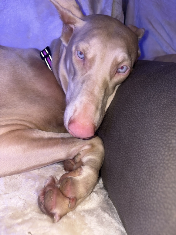 Oh, my favorite human! It's me, Echo! This blanket is sooooo comfy, and these blue eyes are telling you I've been the bestest girl ever. Since I'm a full Doberman and such a sweetheart, could you maybe give me an extra special ear scratch and maybe a tiny piece of that yummy-smelling thing you're holding? Pretty please with a slobbery kiss on top!
