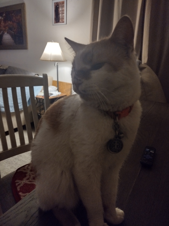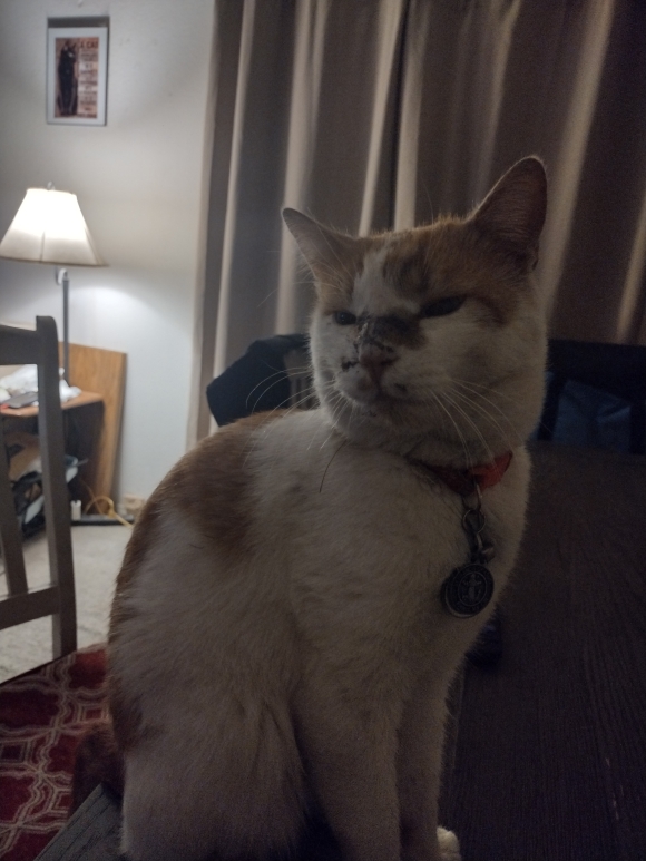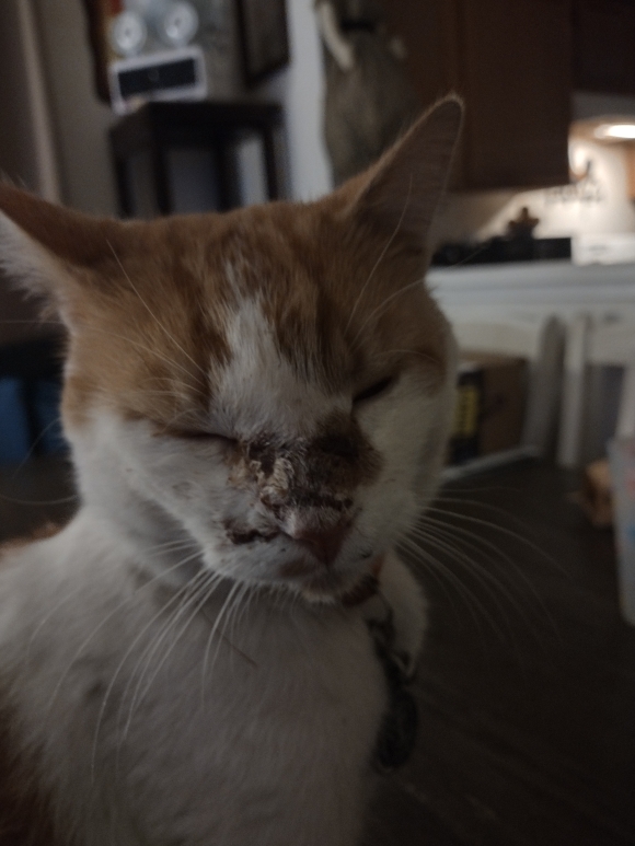 *Purrrr.* Oh, Gingy, my sweet boy. I see your little scabs and your tired eyes. It must be hard for you. Even with that collar and tag, you're still my precious ginger boy.