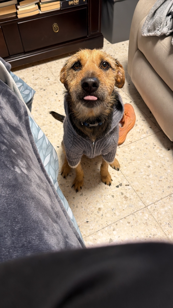 Oh, the world looks so interesting from down here! My big ears are perked, and my green eyes are taking it all in. Being cozy on this soft blanket is lovely, and that orange sweater is so warm!