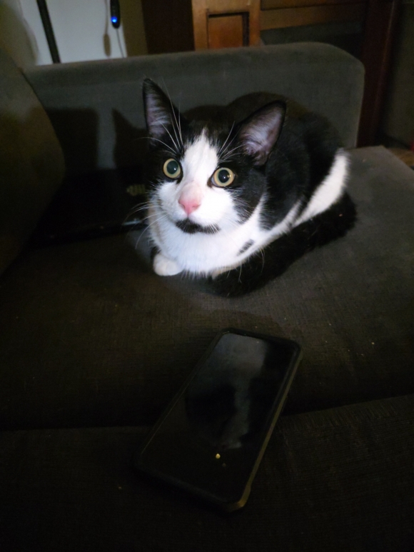 *Purrrr...* Oh, what a lovely nap I was having! My name is Pet 2, a fine Tuxedo boy, just 6 months old. Seeing you capture me so perfectly makes my tail twitch with joy. You're the best human, truly! Could you perhaps scratch that super itchy spot right behind my left ear? It's just *so* good. Thank you!