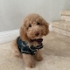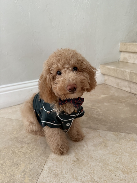 Woof woof! Oh boy, oh boy, look at ME! I'm Bailey, your super-duper happy Apricot Toy Poodle, all dressed up and feeling so fancy in my jammies and this snazzy bow tie! My curly fur is all fluffed, and I'm giving you my bestest, most attentive look. I'm just bursting with energy!