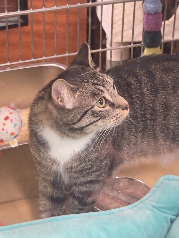 "Oh, hello there! I'm Mochi & Mocha, and while I've got my beautiful tabby stripes and that lovely white patch, right now I'm feeling a bit... wistful. This enclosure is okay, but it's not home. My perfect day? It would involve lots of gentle pets, a sunny spot for a nap, and maybe a good zoomie session followed by some delicious salmon treats. Oh, and a cozy lap to curl up on, with you there, of course!"