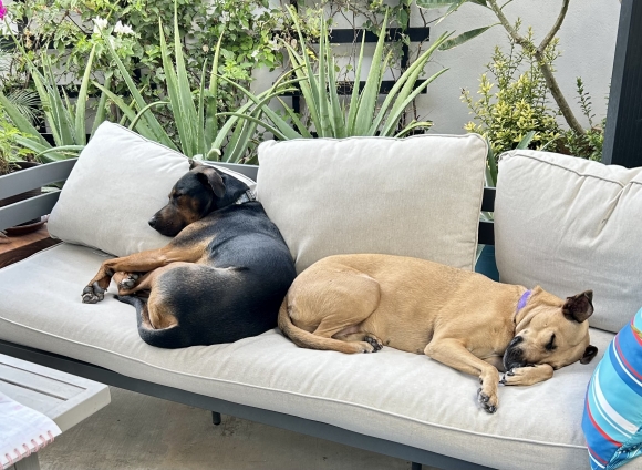 Oh, Owner! Look at us, just two happy pups soaking up this glorious sunshine on our comfy sofa! Gypsy here, feeling so content and loved. This spot is purr-fect for a snooze. Maybe after our nap, we could have a little game of fetch? Or perhaps just a nice, long cuddle? Whatever you want, I'm happy just being with you! Woof!
